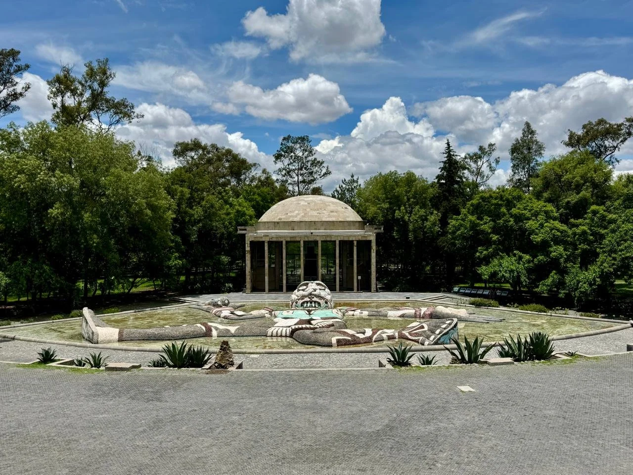 Cuando llegas a este lugar, que además esta en un sitio privilegiado en medio del bosque, lo primero que ves es la fuente imponente de Tláloc. Esta se puede apreciar mejor desde la parte alta de en frente donde hay unas escaleras las cuales puedes subir y así visualizar mejor esta grandiosa escultura y fuente.